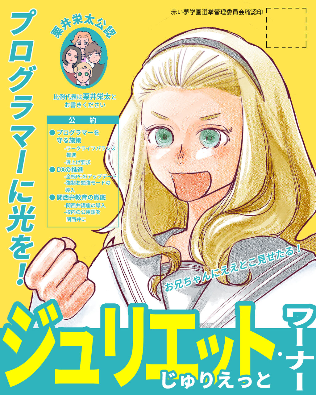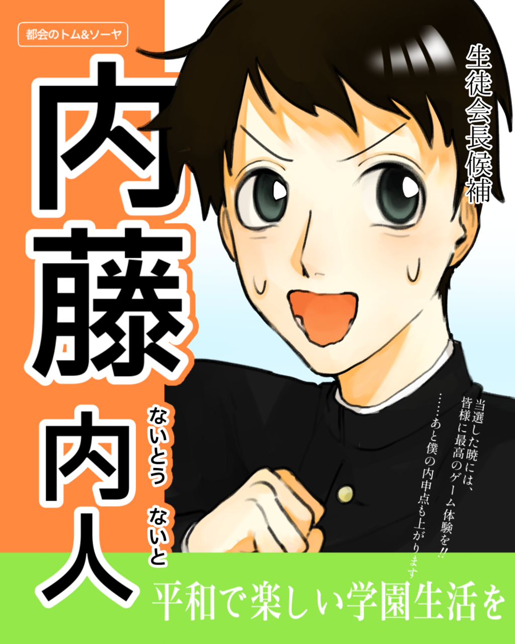 生徒会長という大役に、ちょっぴりビビっている内人の表情がGOOD! 過激な主張が目立つ中、やっぱりフツーで平和が一番ですよね。