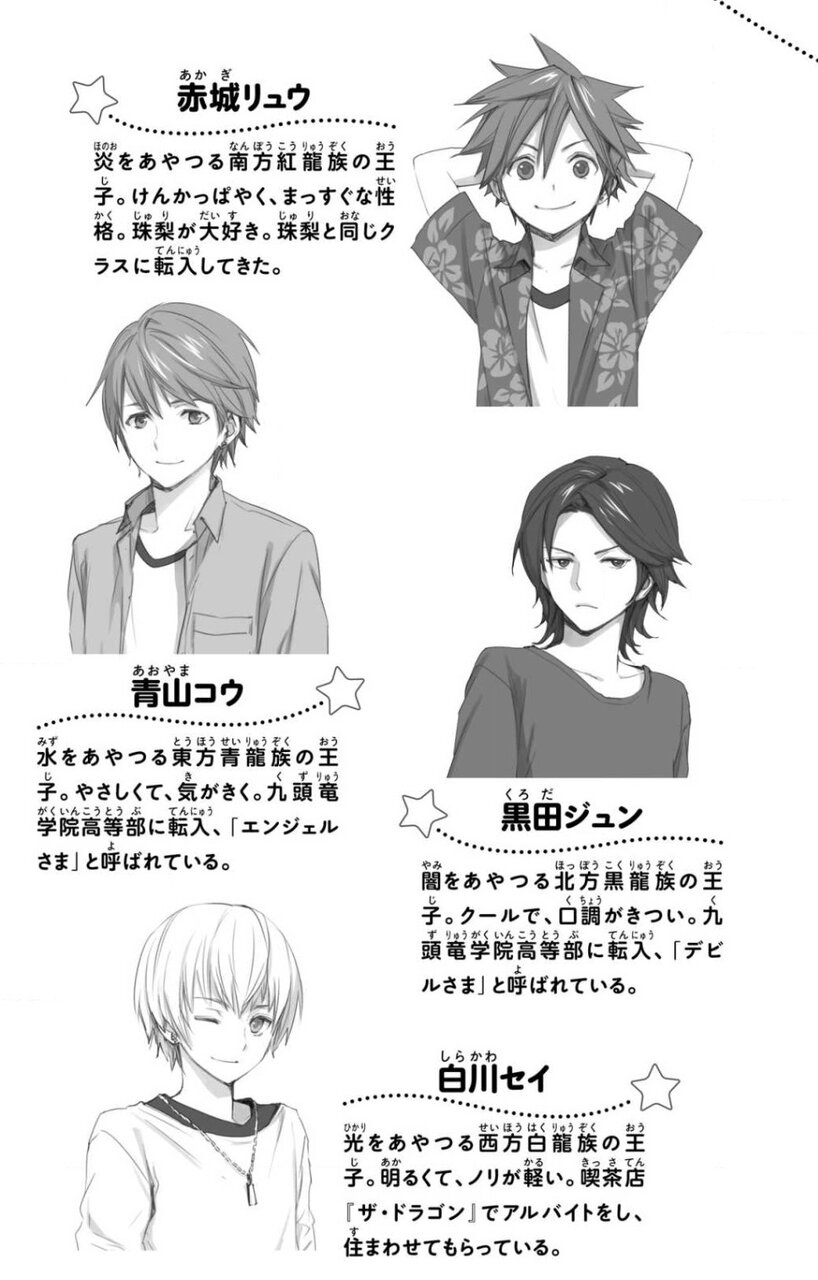 主人公・珠梨の前にあらわれた、4人のイケメンたち。なんとぜんいん、龍族(りゅうぞく)の王子さま。