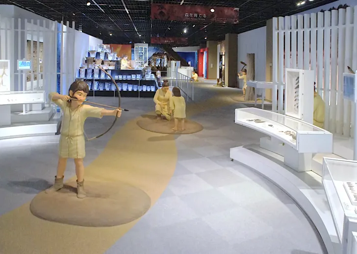 縄文時代の人たちは、自然のめぐみを生かしてくらしていたみたい。三内丸山遺跡の人たちは、山や森で木の実(くるみ・栗など)をひろい、水辺で魚や貝をとって食べていたんだって。弓矢などを使って、ウサギやムササビなどの動物をつかまえることもあった! 食べ物は火で焼いたり、土器で煮たりして調理していたよ。栗はたくさん育てていたようで、ムラの周りには栗の木がたくさんあったことがわかっているよ。季節ごとにとれるものを上手に使って、自然と共に生きていたのが縄文時代の人たちの食生活だったんだね。