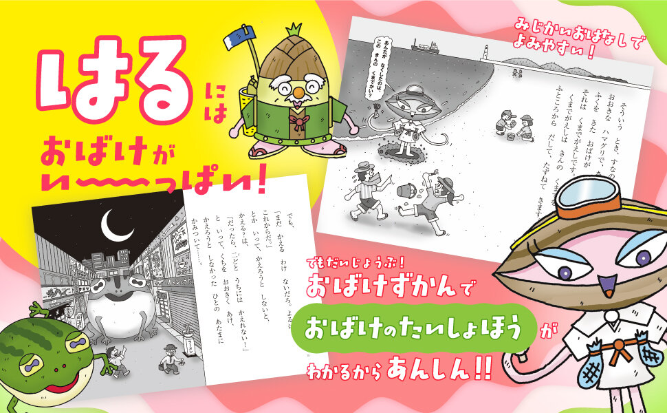 それぞれのおばけが、どんなふうに怖いのか、どうすればだいじょうぶなのかを、ユーモラスな短いお話仕立てで紹介します。