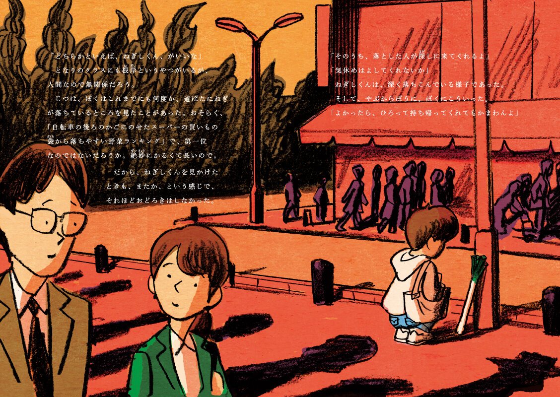 少年がまちかどに落ちたねぎを拾おうとすると、