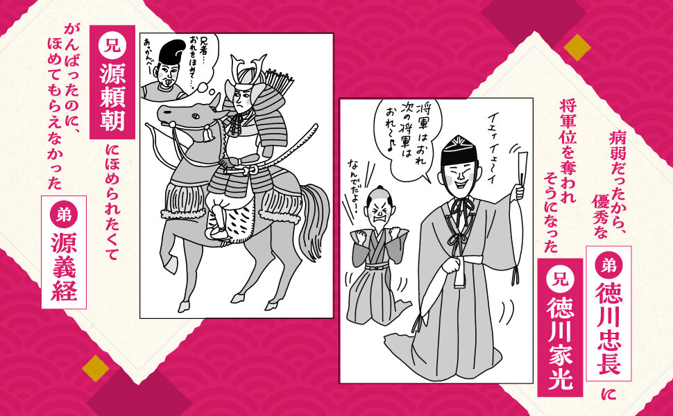 天智天皇・天武天皇 源頼朝・義経 足利尊氏・直義 織田信長・信勝 豊臣秀吉・秀長 真田信之・信繁 茶々・初・江 徳川家光・忠長 坂本権平・乙女・龍馬 西郷隆盛・従道 秋山好古・真之