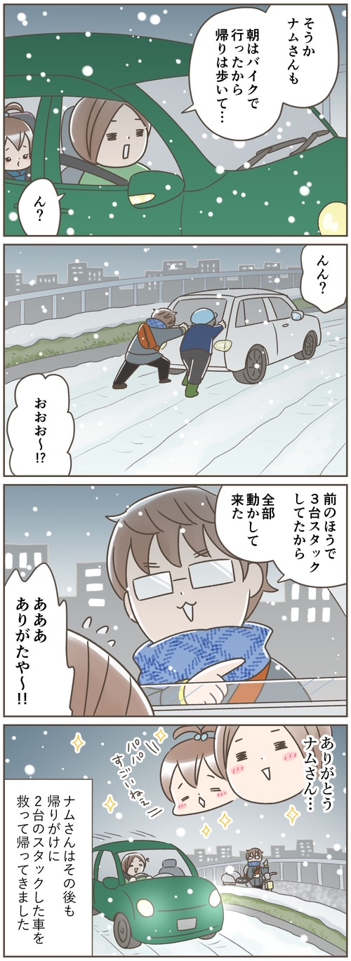 私も以前は何度も雪道で泣きそうになったことがあったので、私がスタックした側だったらナムさんは神だな……と、拝むような心持ちになりました。