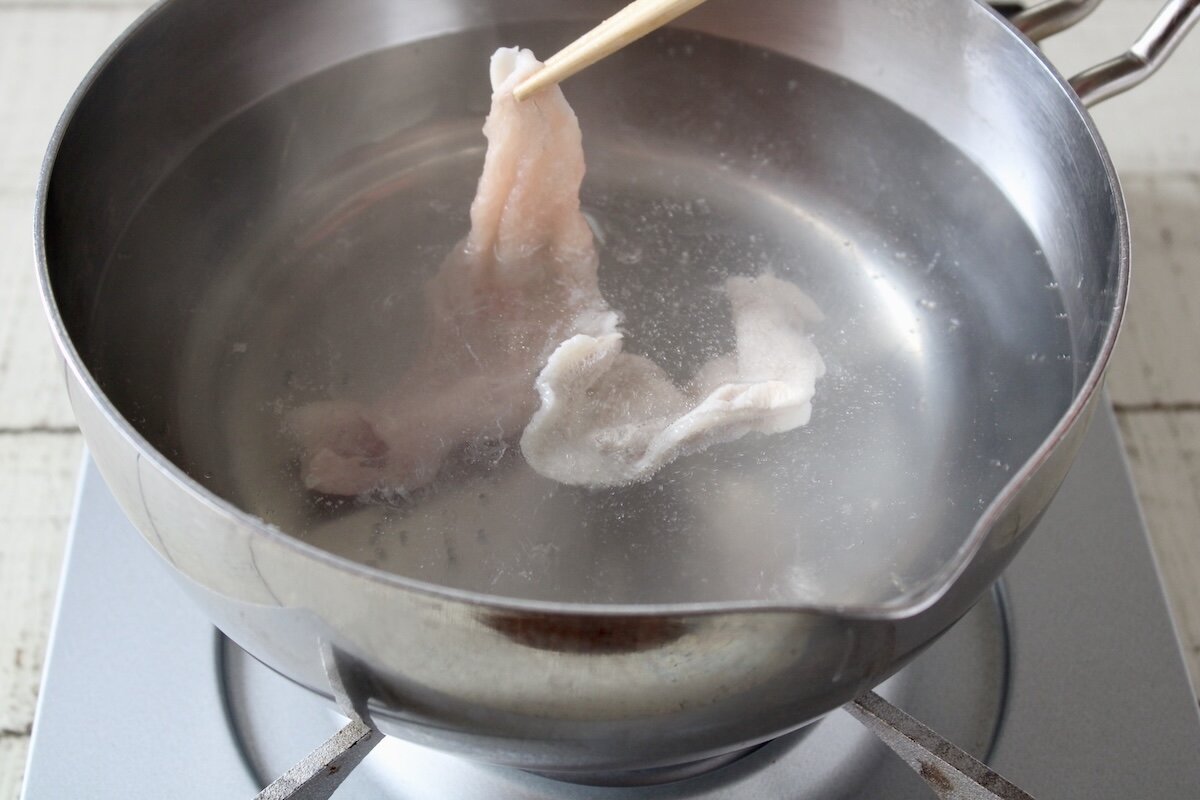 4.別の鍋に湯を沸かして酒を加え、弱火にして豚肉を1~2枚ずつ広げて入れる。色が変わったらザルにあげ、水気を切る。残りの肉も湯に入れてザルにあげるのを繰り返す。