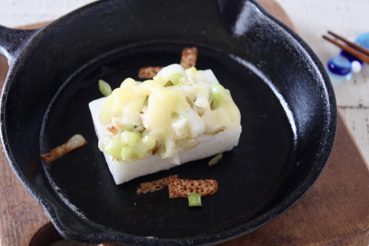 ねぎをバターで炒めて、餅とチーズと一緒に焼いた一品。甘く仕上がったねぎにチーズのまろやかさと餅のもちもち食感が加わり、子どもにも食べやすくなります。