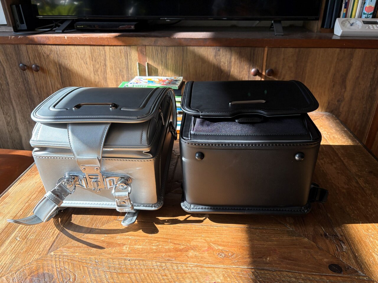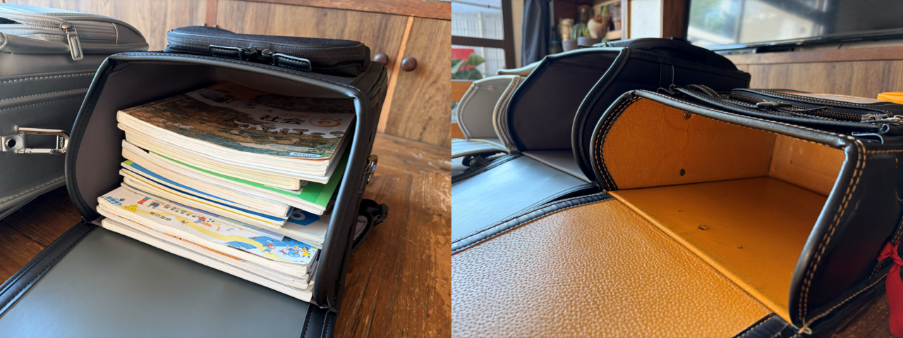 そして、両モデルの収納量ですが、とにかく広くてたくさん荷物が入ります。長男に「6年生のときに使っていた全教科分の教科書持ってきて」とお願いしたところ、ぜんぶすっぽり。実際にはここにタブレットや筆箱なども加わるけど、十分な広さです。