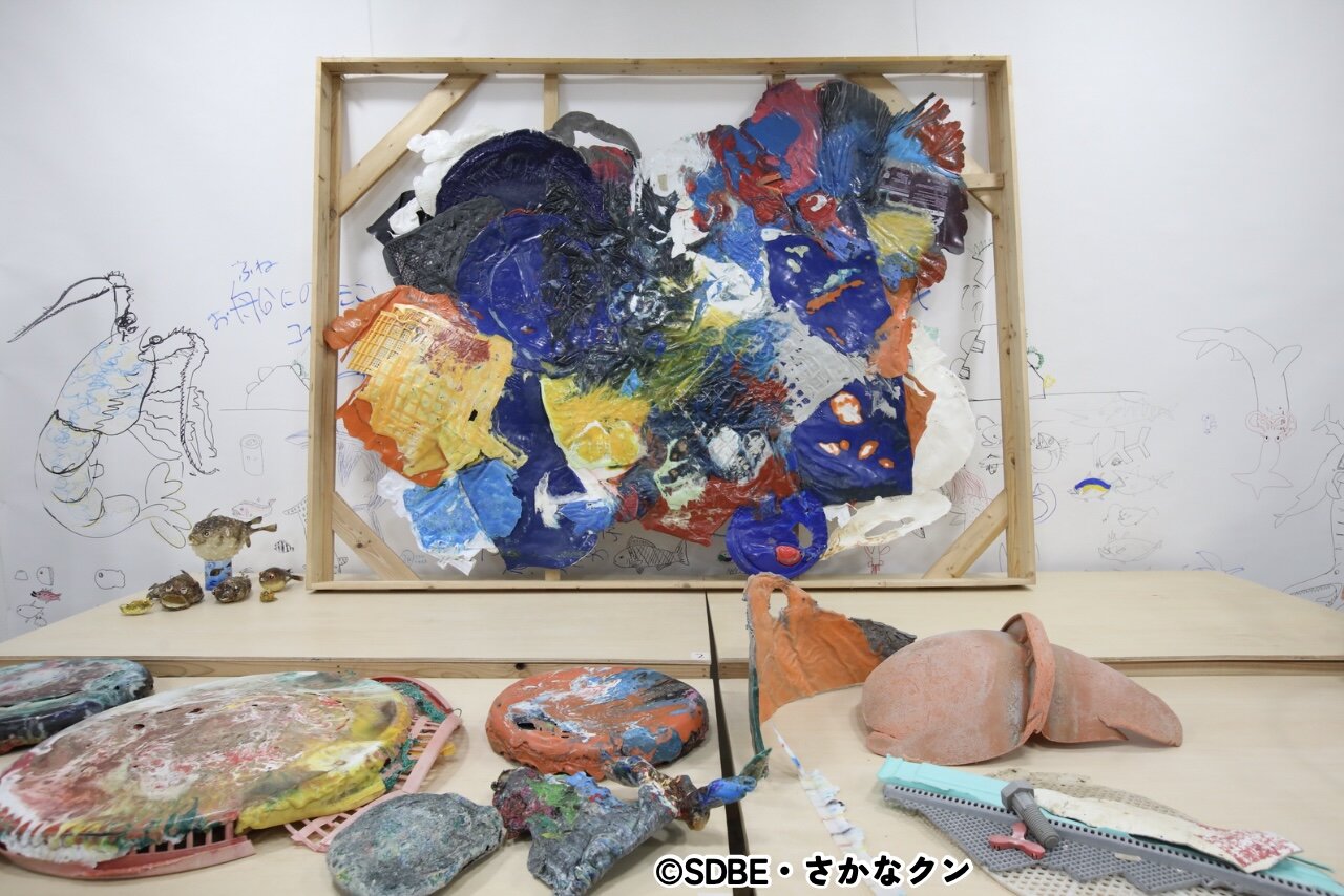 藤元先生の作品。国境を越えた海洋プラごみ、漁具などがひとつになり、アートとして表現されています。
