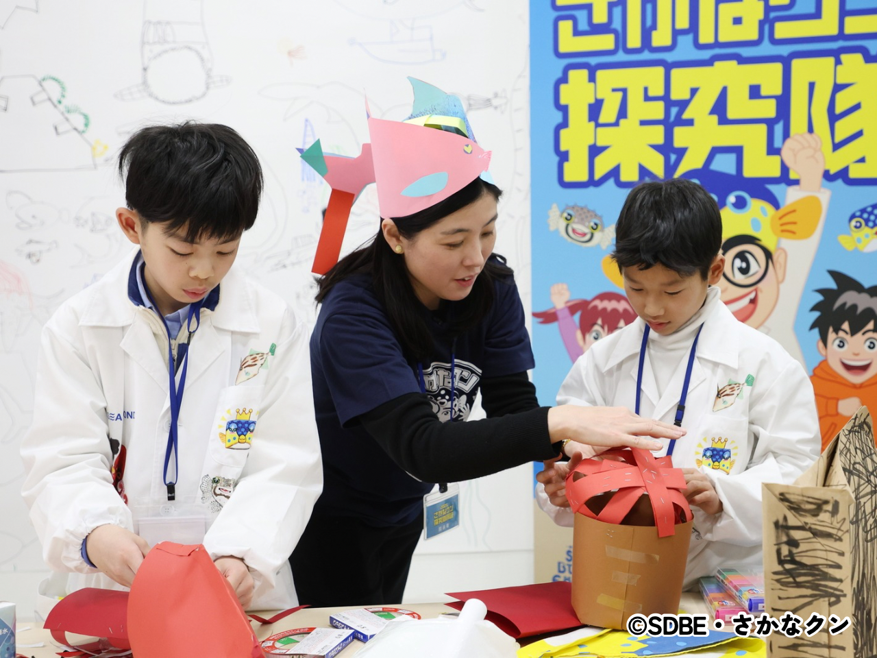 図鑑を見ながら自分の大好きなお魚をモチーフにしたり、イメージを膨らませて空想のお魚を描いたり、それぞれ夢中になって帽子づくりに取り組んだ子どもたち。中には「時間が足りないよ~」「もっと作りたい!」という隊員の姿も。さかなクンをはじめ、東京藝術大学出身のMCハマジー、東京藝術大学の先生たち、ボランティアの学生さんたちも、子どもたちに負けじと制作に参加。たくさんの個性あふれる“すギョいお魚の帽子”が完成しました。