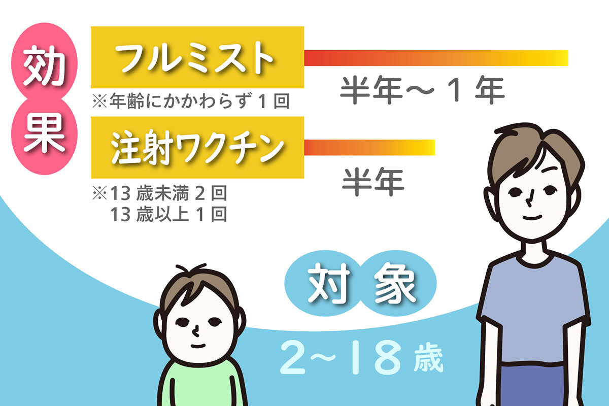 従来の注射型ワクチンは13歳未満が2回、13歳以上が1回の接種で、半年ほど効果が続きます。これに対してフルミストは、年齢にかかわらず1回の接種で完了し、効果も半年から1年ほど持続するといわれています。