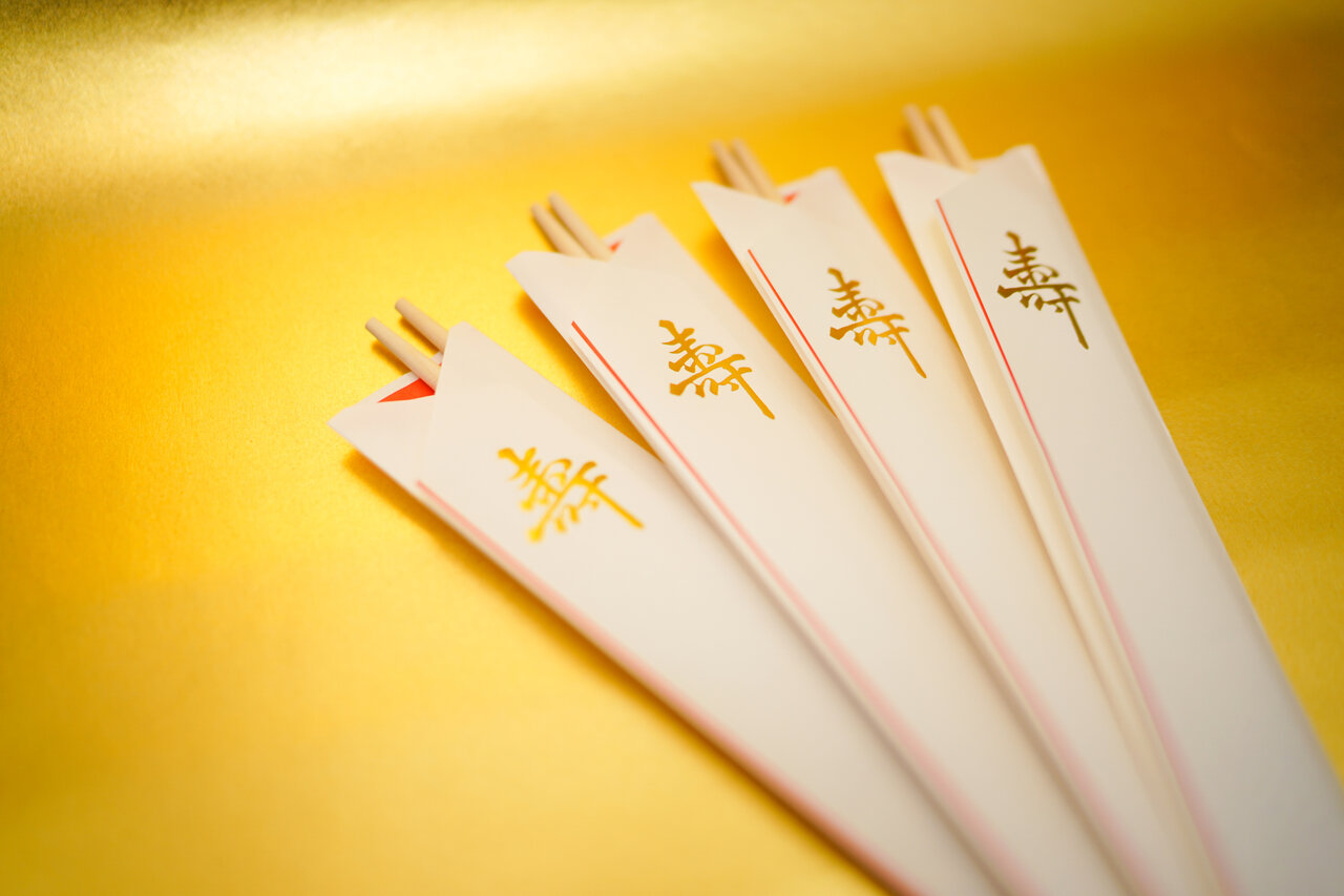 おせちをいただくときは、慶事用の「祝い箸」を使いましょう。祝い箸は左右、両方削ってあり、一方を神様用と考え、神様と人が共に食事をすることを表しています。両方使えるからといって、ひっくり返して取り箸として使ってはいけません。