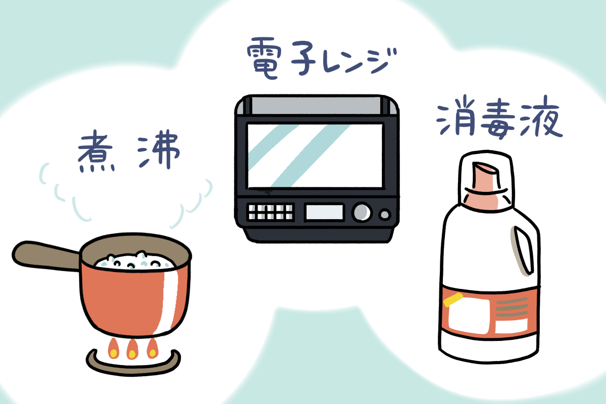 哺乳瓶の消毒には「煮沸」「電子レンジ」「消毒液」の3つの方法があります。ママパパのライフスタイルに合わせて、少しでも負担のない方法を選びましょう。