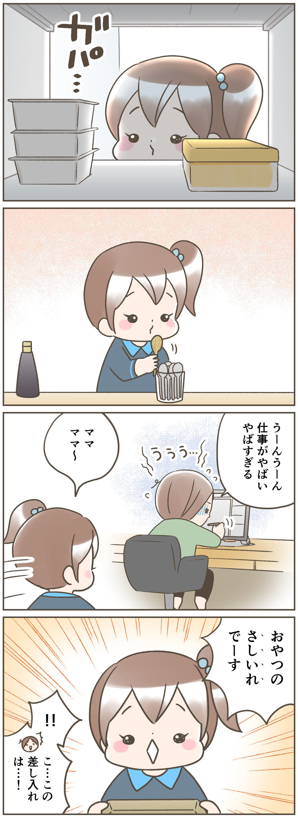 仙台市在住のイラストレーター・ナコが描く『ナコ家の頑張らない子育て in 東北』。5人家族の何気ない日常や子育ての「あるある」を、東北・仙台からゆる~くお届けします。第98回は、「三女がおやつに差し入れてくれたもの」というお話です。