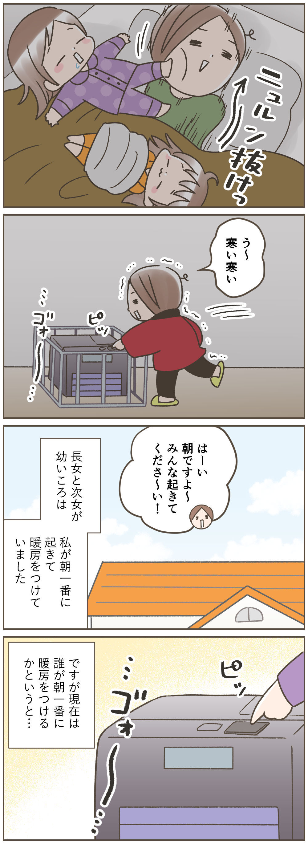 長女と次女が幼いころは、毎朝、私が早起きをして冷えきった部屋を暖めてから、子どもたちを起こしていました。