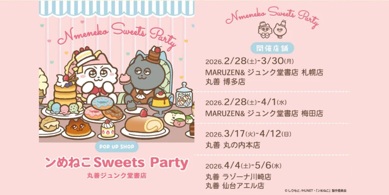 「Nmeneko Sweets Party」が丸善ジュンク堂書店の対象店舗で開催中!スイーツに囲まれたンめねこたちのガーリーなグッズをお買い求めいただけます。