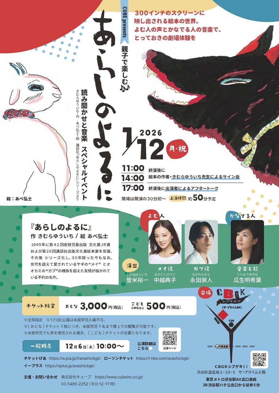 愛されて30年のロングセラー絵本『あらしのよるに』を【読み聞かせ×音楽】で楽しめるスペシャルイベントが2026年1月12日(月・祝)に開催されます。1日3公演・東京・渋谷のCBGKシブゲキ!!にて上演いたします。