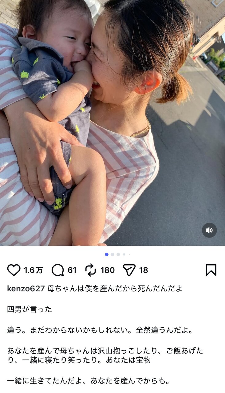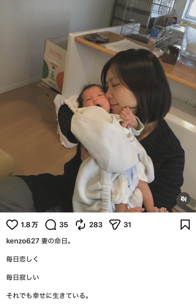 なかでも359万回と最多の閲覧数(2026年3月時点)を記録したのは、顕蔵さんが妻への思いをストレートに綴った投稿でした。添えられていたのは生まれたての三男を抱く亡き妻の写真。