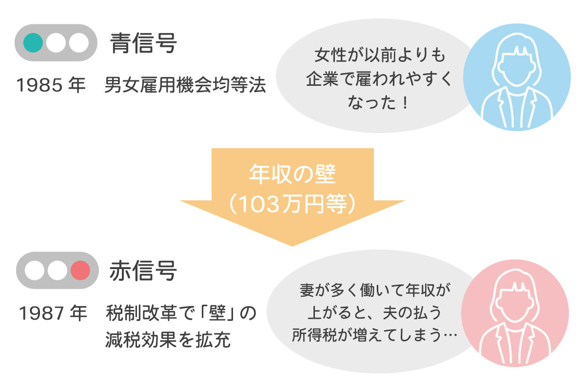 ならば結婚している女性は「年収の壁」にぶつかるほどには働かず、その分家事や育児を担っていた方がいい。正社員の女性も、結婚とともに職を変え、パートやアルバイトで年収が上がりすぎないように抑えた方がいい……そう意識させる「年収の壁」拡充が、男女雇用機会均等法の成立から2年後に、行われたのです。
