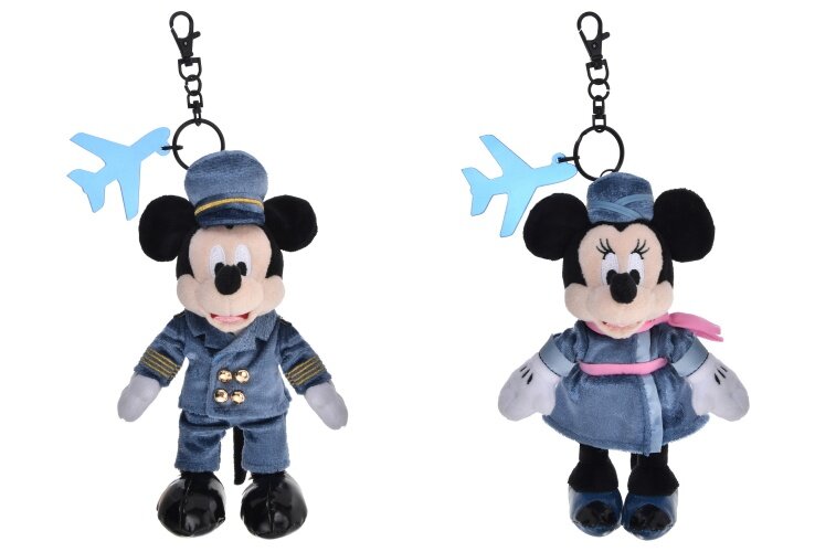 飛行機のマークが入ったタグが旅気分を盛り上げます。ミッキーマウスとミニーマウスのぬいぐるみキーホルダー 各2800円