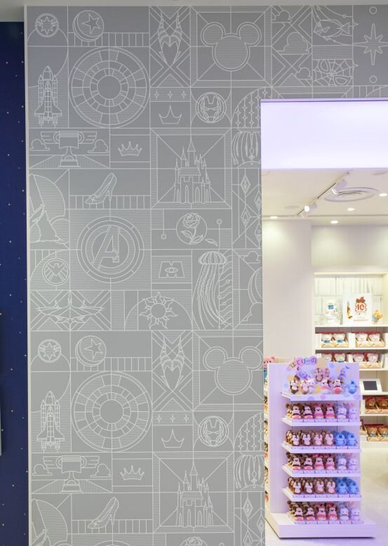 この写真はディズニーフラッグシップ東京の店内の様子。壁面のデザインをよーく見ると、ディズニーやマーベルのモチーフがさりげなくデザインされています。