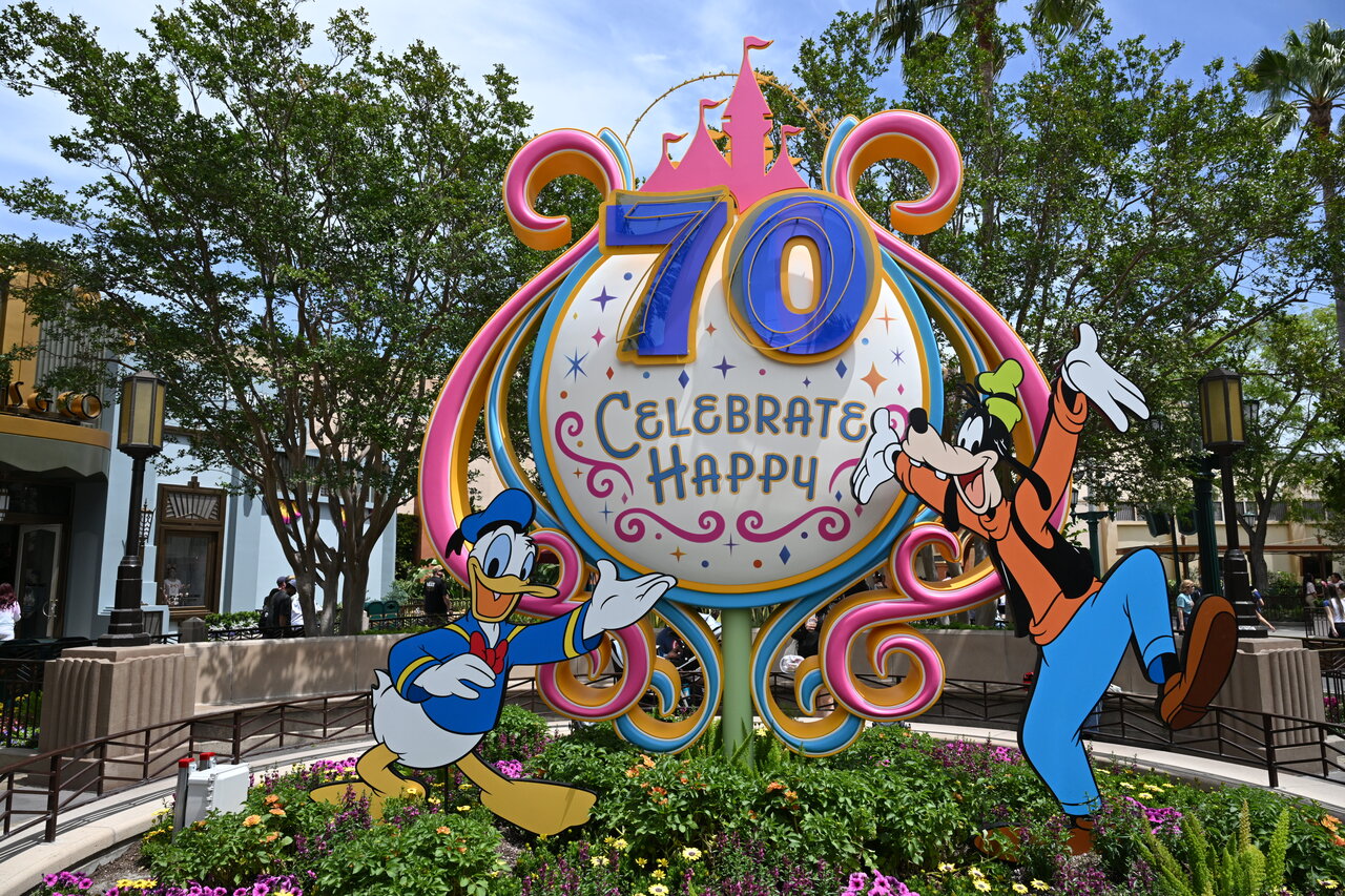 ディズニー・カリフォルニア・アドベンチャー・パークも、70周年のすてきなデコレーションでいっぱいです。注目はカーセイ・サークルにあるドナルドとグーフィーのパネル。そして、70周年のパネルで飾られたカーセイ・サークル・レストランです。