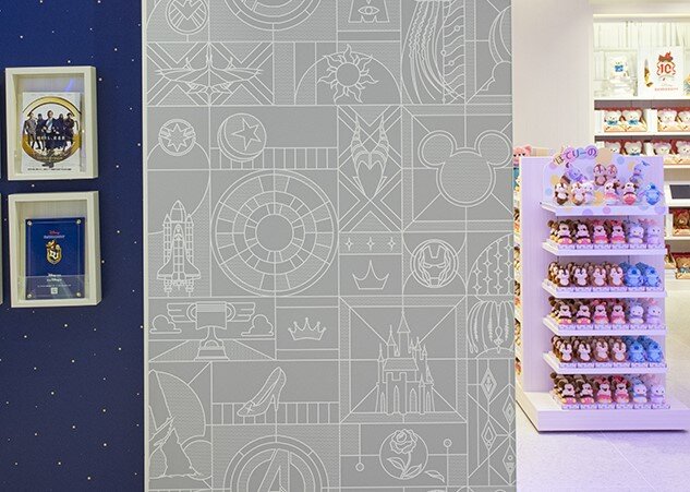 この写真はディズニーフラッグシップ東京の店内の様子。壁面のデザインをよーく見ると、ディズニーやマーベルのモチーフがさりげなくデザインされています。