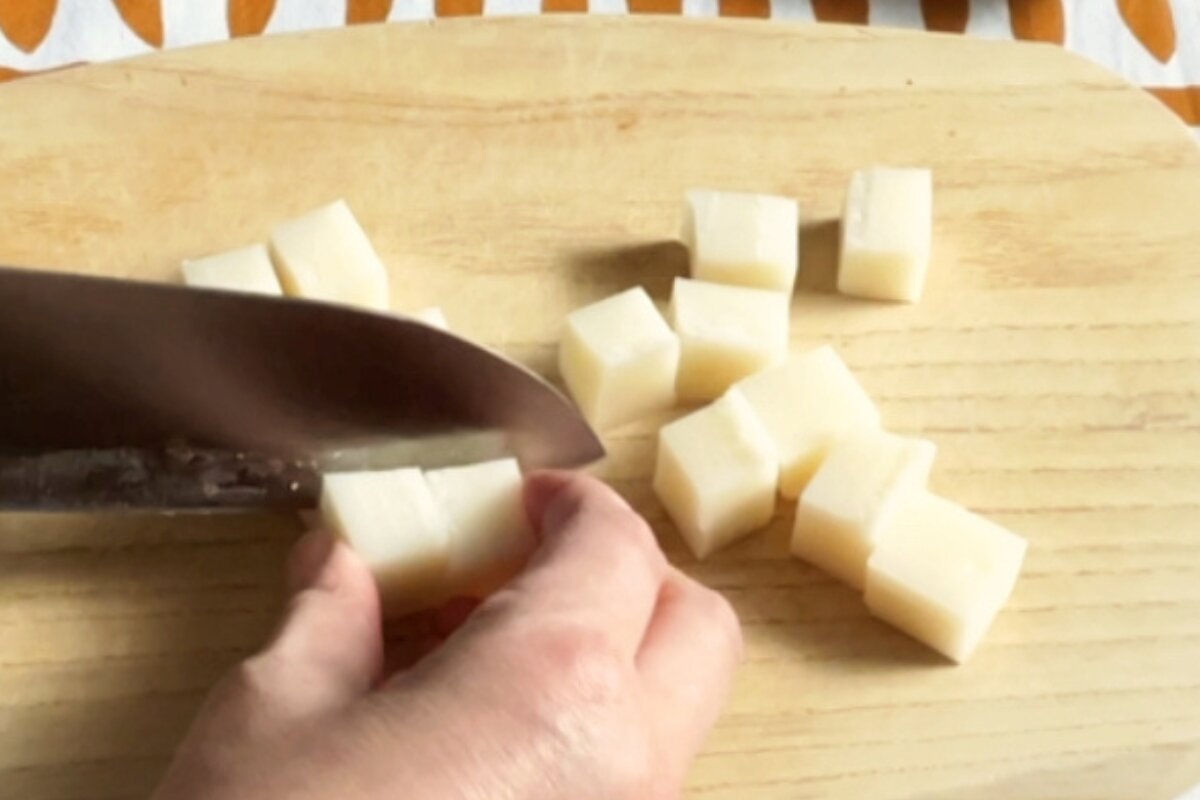 ①切り餅2個はそれぞれ8等分に切り分ける。耐熱ボウルに入れ、牛乳100ml、砂糖小さじ4も加えて軽く混ぜる。