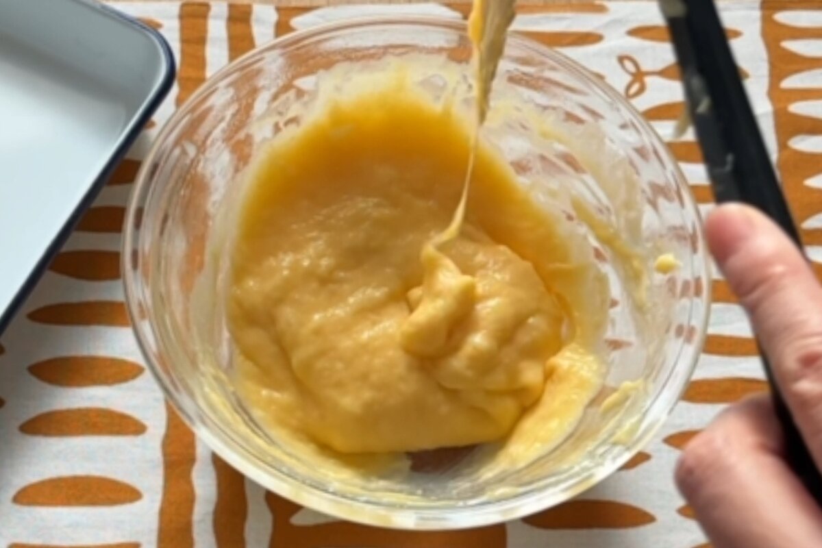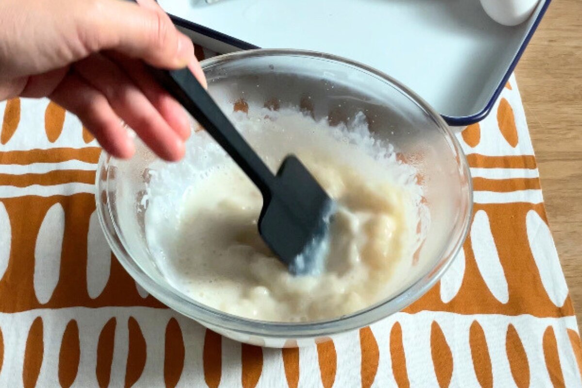 ④卵を加え、さらにしっかりと混ぜ合わせる。