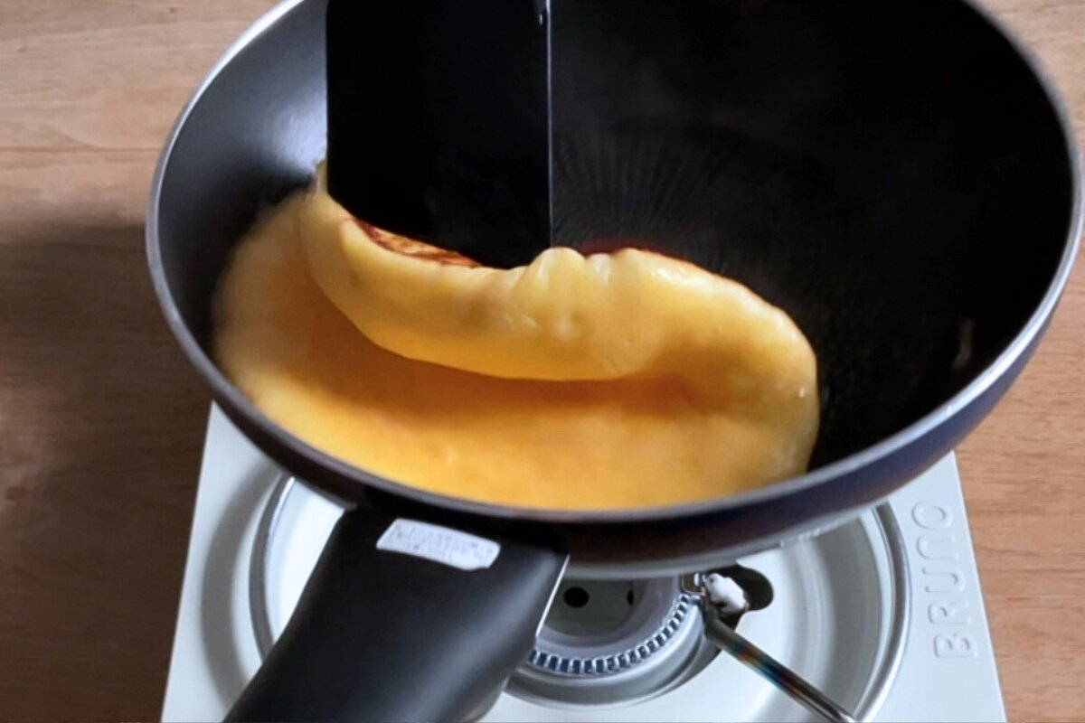 ⑤フライパンを熱し、バター5gを溶かす。④の生地を半分流し入れ、ふたをして弱火で6分ほど焼く。