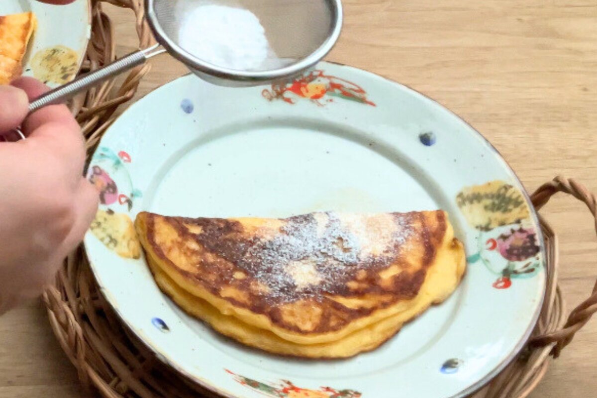 ⑦残り半分の生地も同じように焼き、仕上げに粉糖を振り、はちみつまたはメープルシロップ各適量をかける。いちご適量をお好みで添えたら完成。