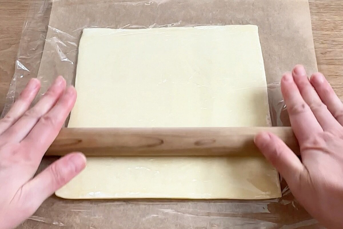 ①パイシート150gを解凍してから、めん棒でひと回り大きくなるまで伸ばす。
