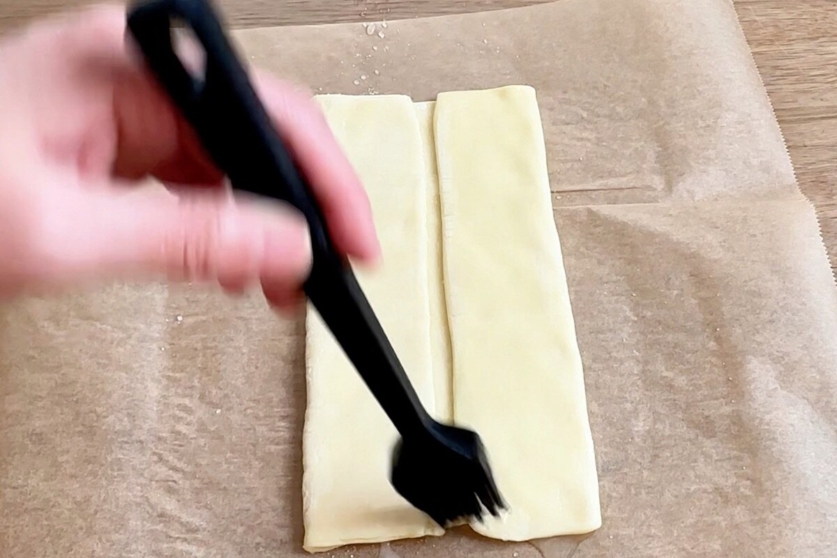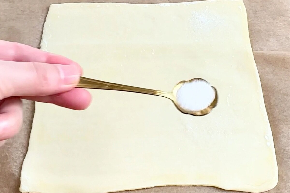 ②①のパイシートの表面にはけで水(分量外)を適量塗り、グラニュー糖大さじ1をまんべんなく全体にふりかける。