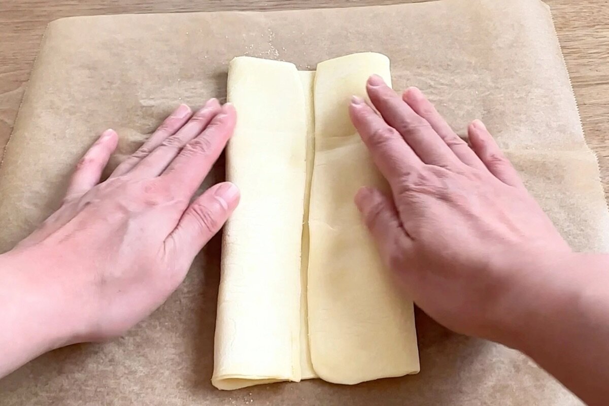 パイを折りたたむ際は、両側の幅を揃えると、ハート上部の高さが揃い、焼き上がりにきれいなハート形になります。