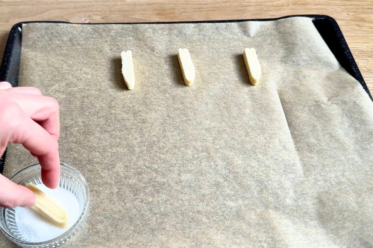 ⑥表面にグラニュー糖(分量外)を適量まぶしてから、クッキングシートを敷いた天パンに間隔をあけて並べる。