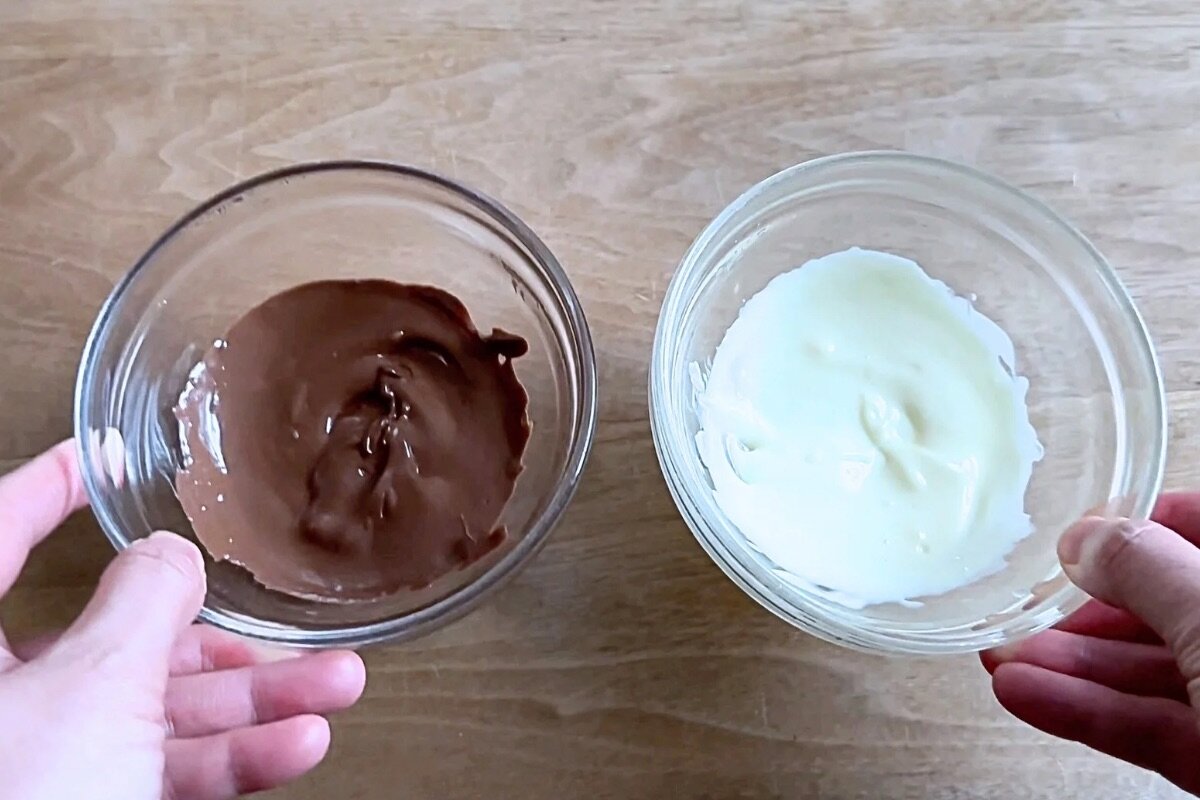 ⑧板チョコ(ミルク、ホワイト各1/2枚)は包丁で刻んで湯煎にかけて溶かす。