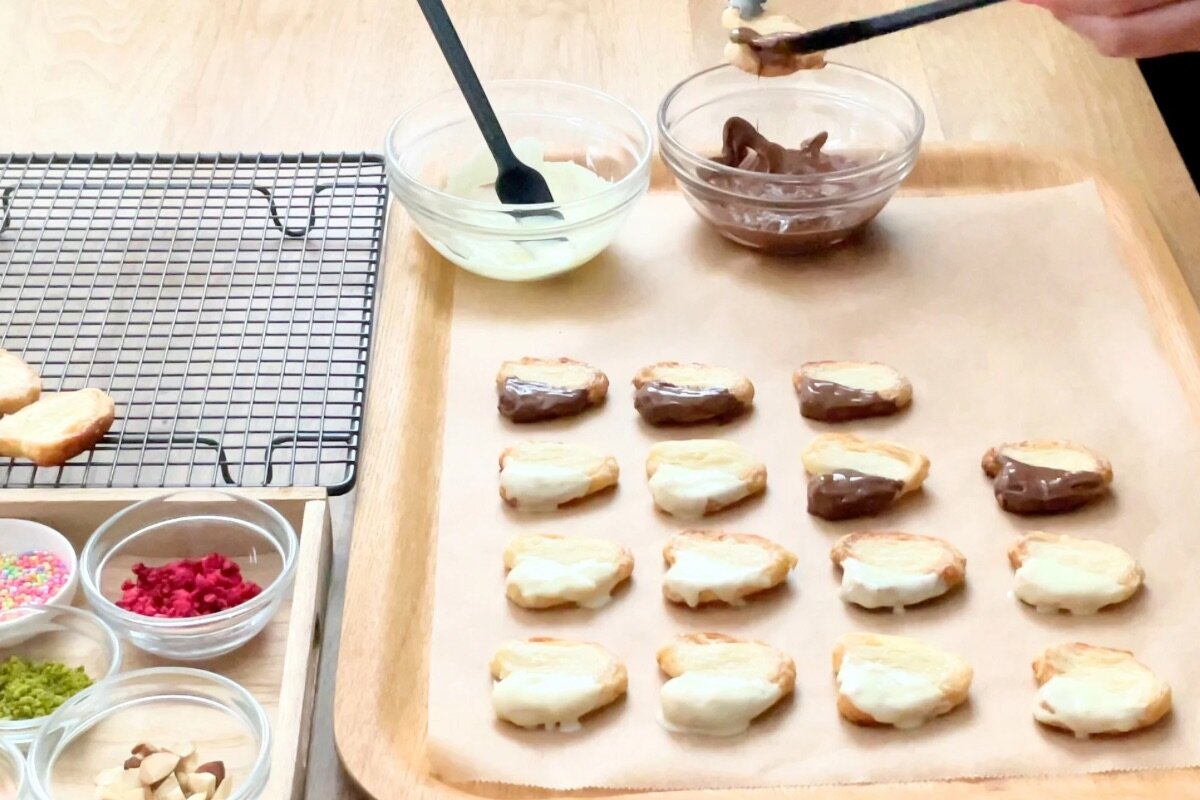 トッピングした後に冷蔵庫で少し冷やすと、チョコレートがパリッと固まり、ラッピングがしやすくなりますよ!
