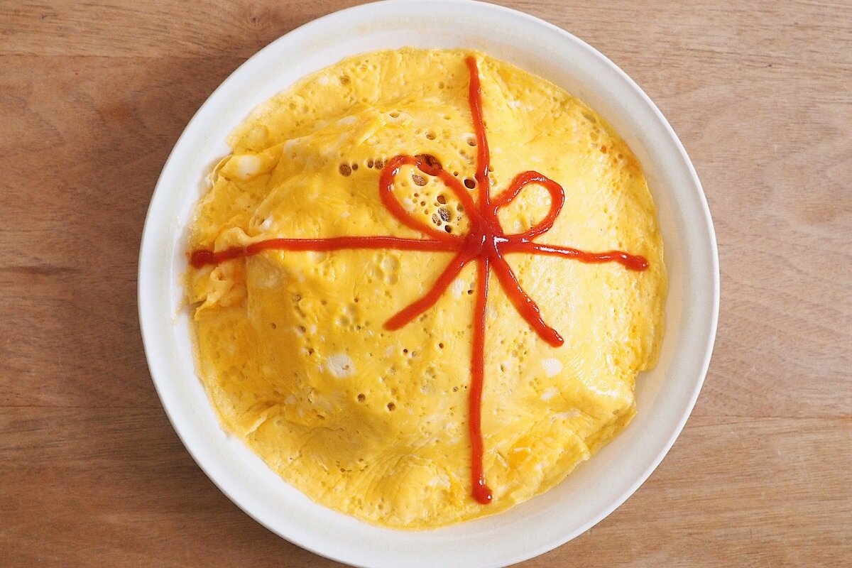 ⑦オムライスの上に、⑥のケチャップでリボンを描いたら1人分の完成。⑤~⑦を繰り返し、人数分仕上げる。