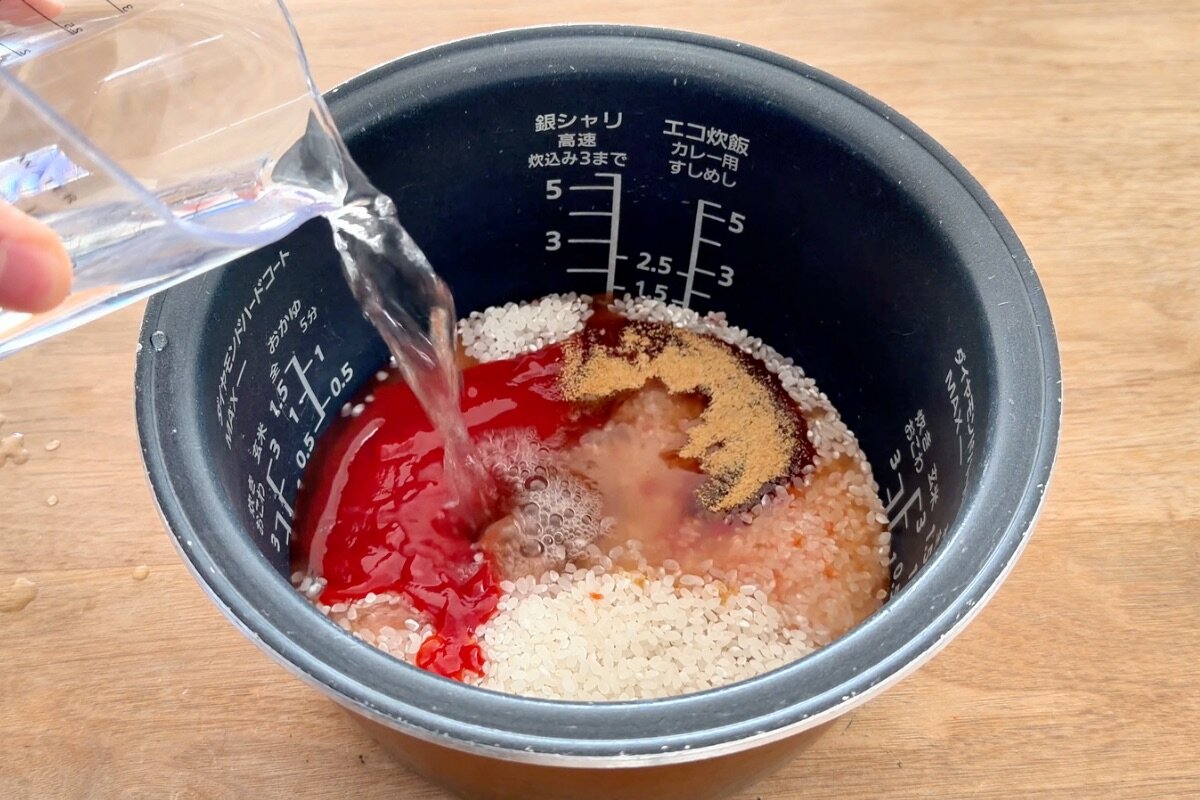 ②炊飯器の釜に、研いだ米とケチャップ大さじ5、ソース大さじ1、コンソメ(顆粒)小さじ1を入れ、2合の目盛りまで水(分量外)を注ぎ、よく混ぜ合わせる。