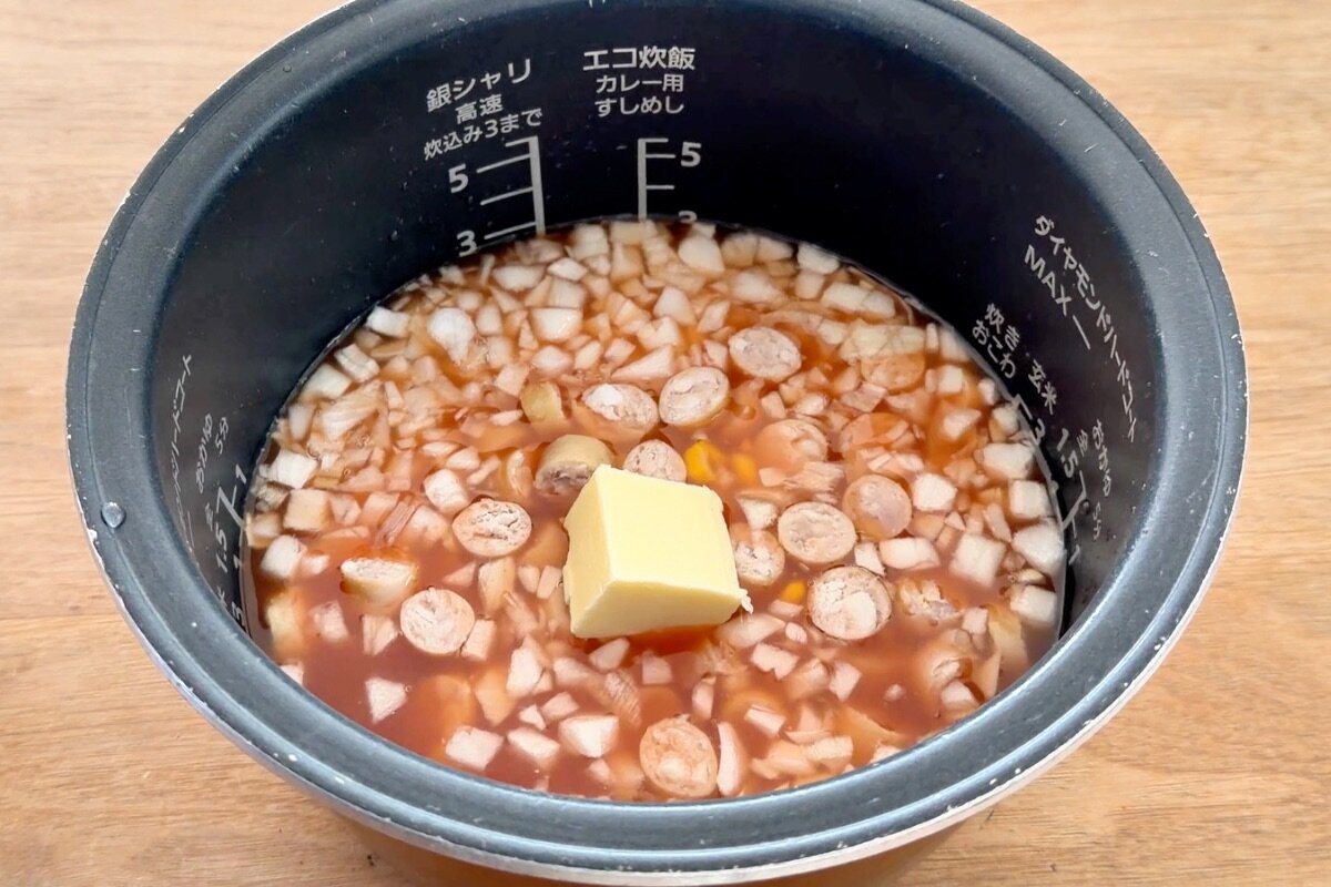 ③②に①の玉ねぎとウインナー、コーン(缶)50g、バター20gを入れて、通常モードで炊飯する。