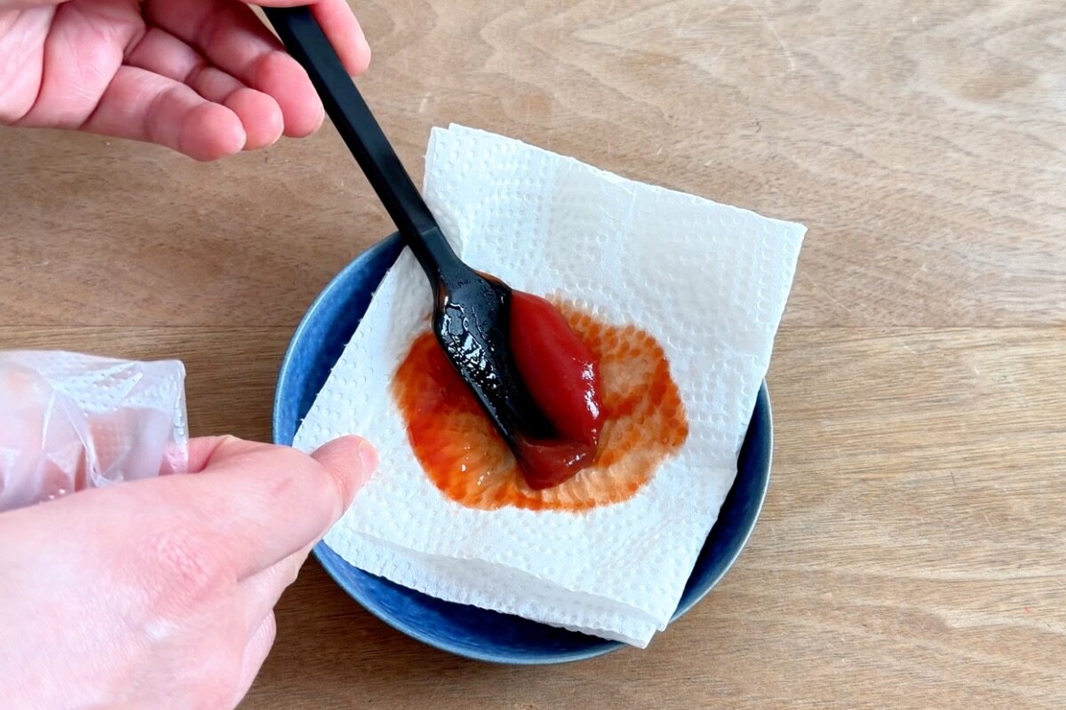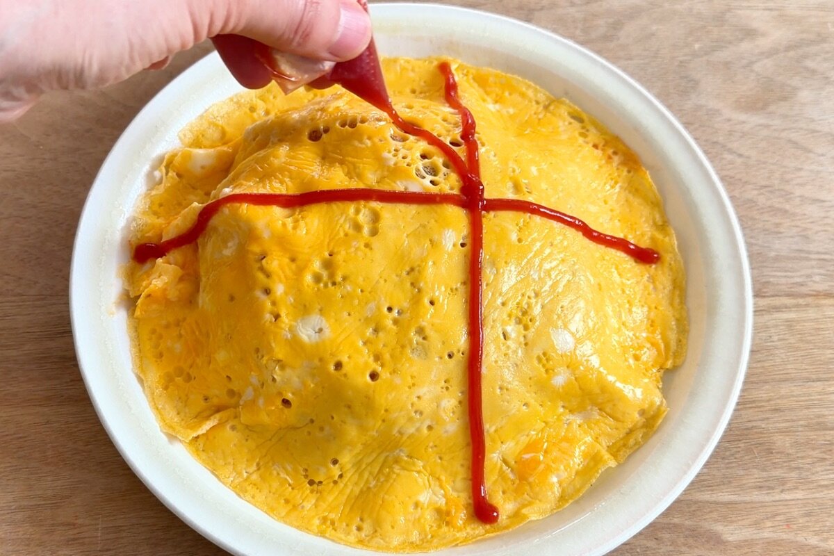 ケチャップの水気を取ることで、デコレーションがしやすくなります。