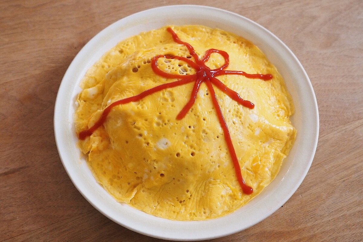 ⑤薄焼き卵を一人分ずつ焼く。ボウルに卵1個、牛乳大さじ1、マヨネーズ小さじ1/2を入れ、白身を切るようによく混ぜる。フライパンにサラダ油適量を入れて火をつけ、卵液を流し入れて、弱火でじっくり焼く。表面が固まってきたら、④のケチャップライスの上にふんわりと被せる。