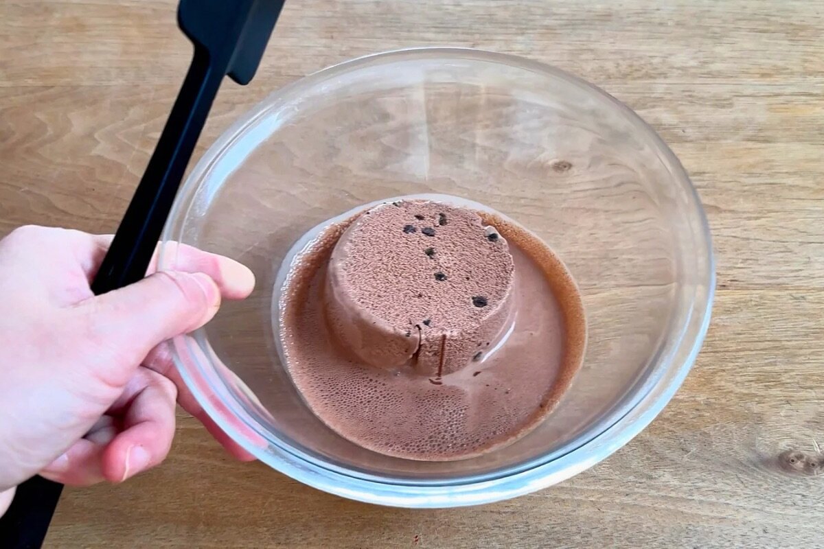 ①耐熱容器にチョコレートアイス1個(200ml入り)を入れて、電子レンジ(600W)で40秒加熱する。