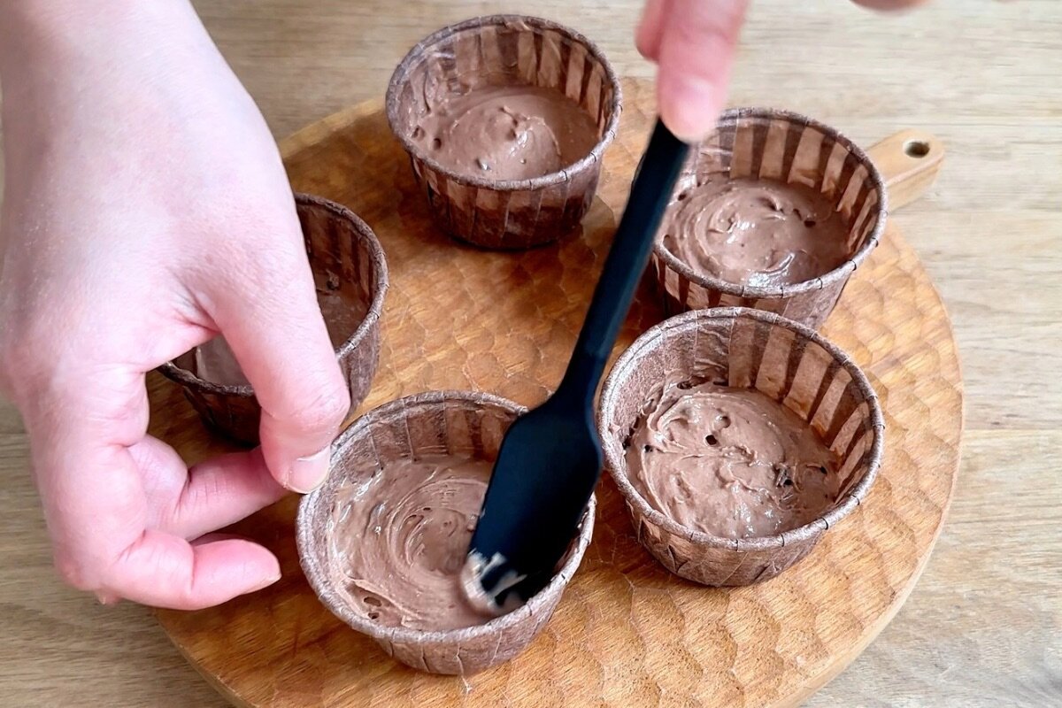 ③②をマフィン型5個(直径5.4cm×高さ4cm)に均等に入れ、表面を平らにする。