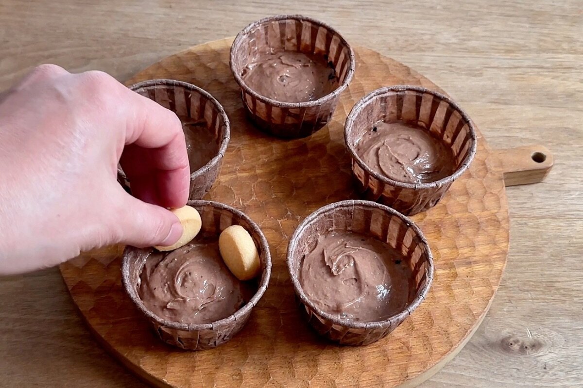 ④くまにするカップのみクッキー2個を入れ、170度に予熱したオーブンで20分焼く。