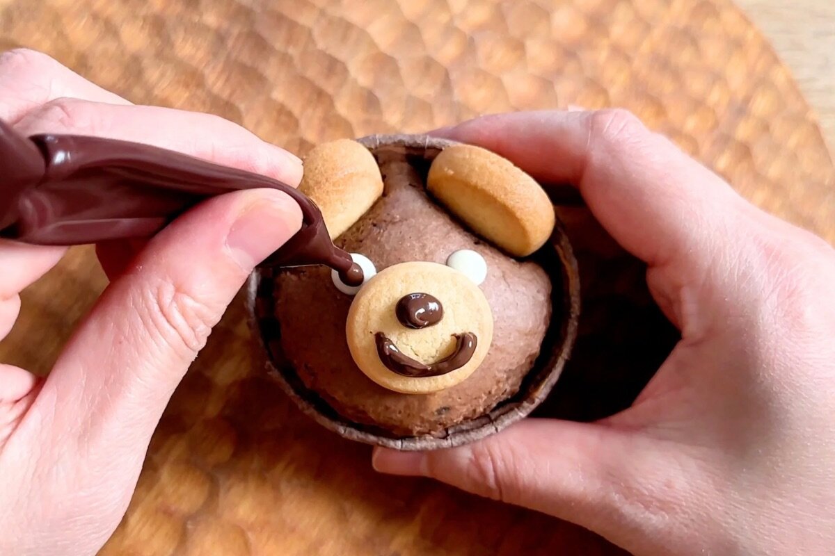 ⑤焼けたら粗熱が取れるまで冷まし、それぞれデコレーションをする。くまは、鼻と口の部分にチョコペンで少しチョコをつけてからクッキー1個を置く。さらに目・鼻・口をチョコペン(ホワイト・チョコ)で描く。