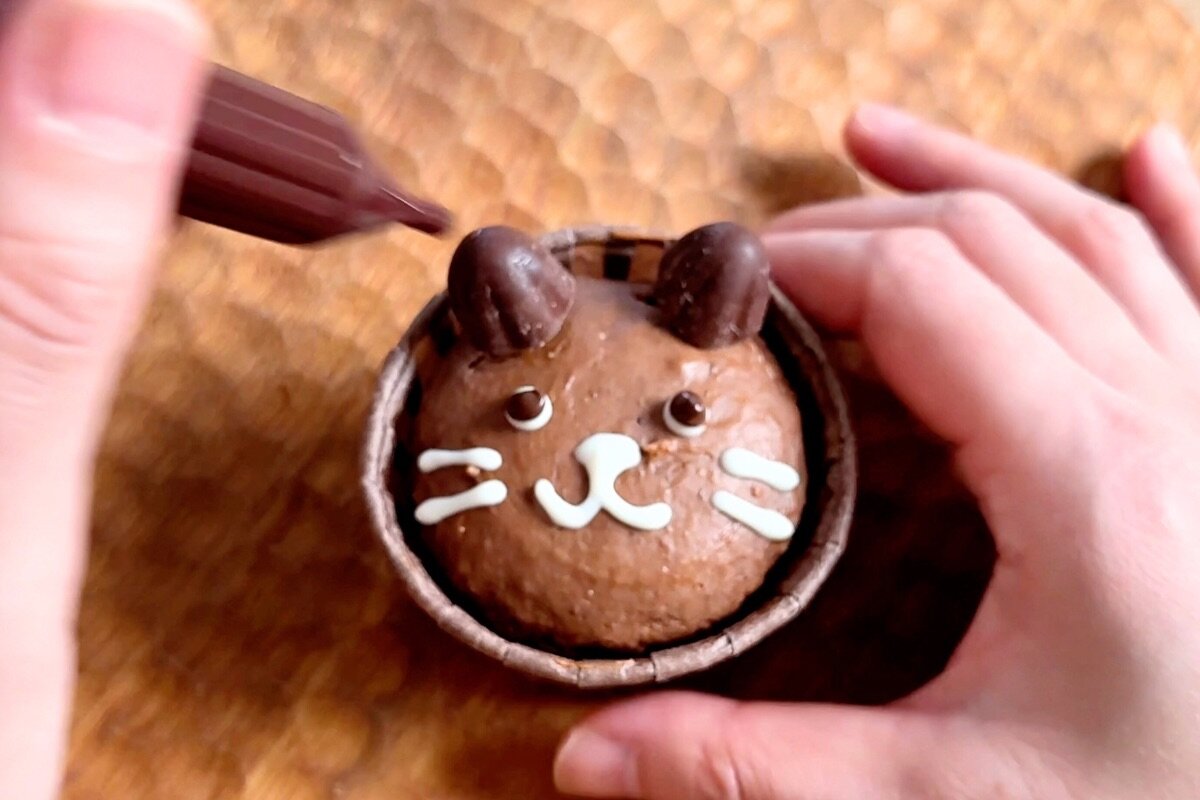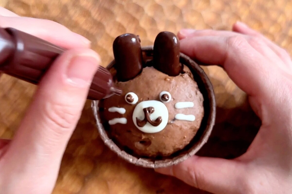 うさぎは長細いチョコレート菓子、ねこは三形のチョコレート菓子を、それぞれマフィンの上部分に二ヵ所切り込みを入れてから挿し入れて、目・鼻・口・ひげをチョコペン(ホワイト・チョコ)で描く。