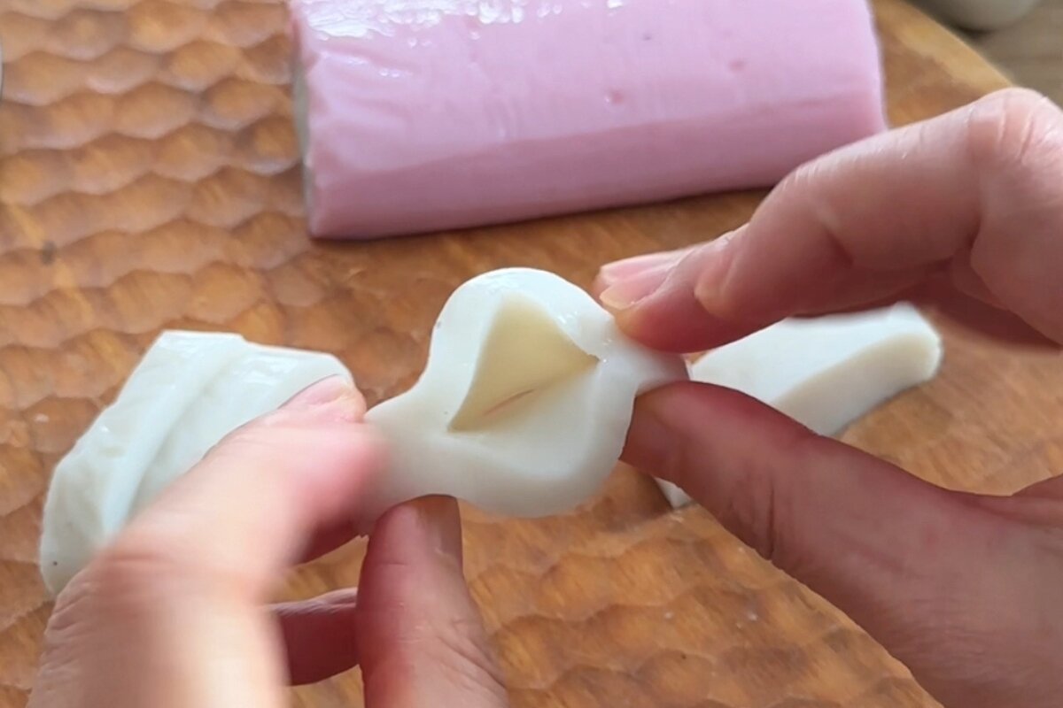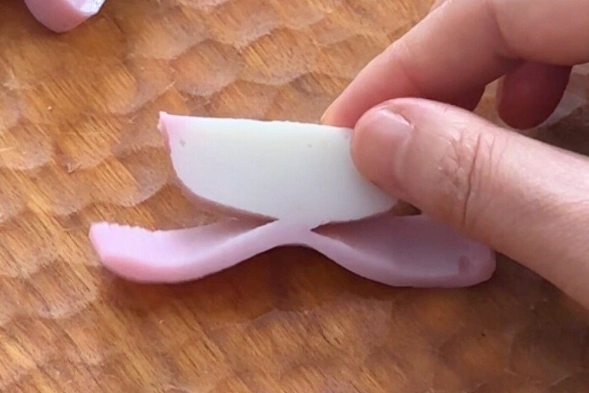 ①紅かまぼこを1cm幅に切り、真ん中を残すようにして、ピンク色の部分を薄く切る。