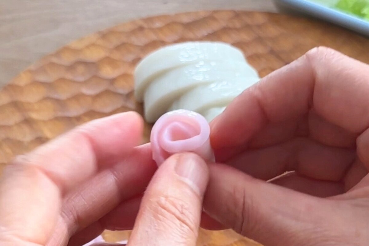②紅かまぼこを幅2mmにスライスし、縦にくるくると巻いて、バラの形にする。