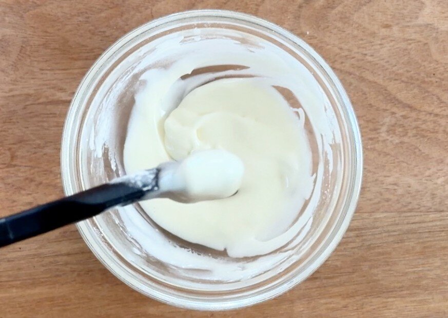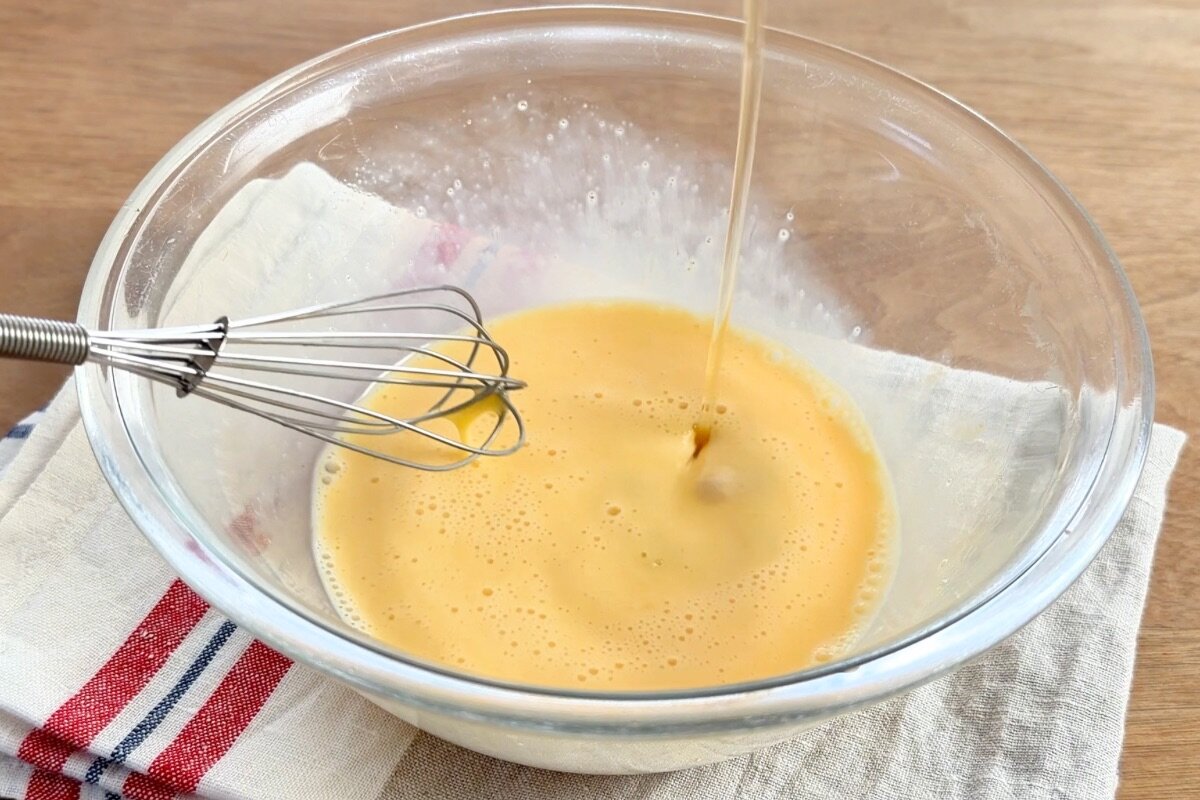 ①卵1個を溶いてから、砂糖5gと牛乳60mlと一緒に混ぜ、最後に米油12gを加えてよく混ぜる。