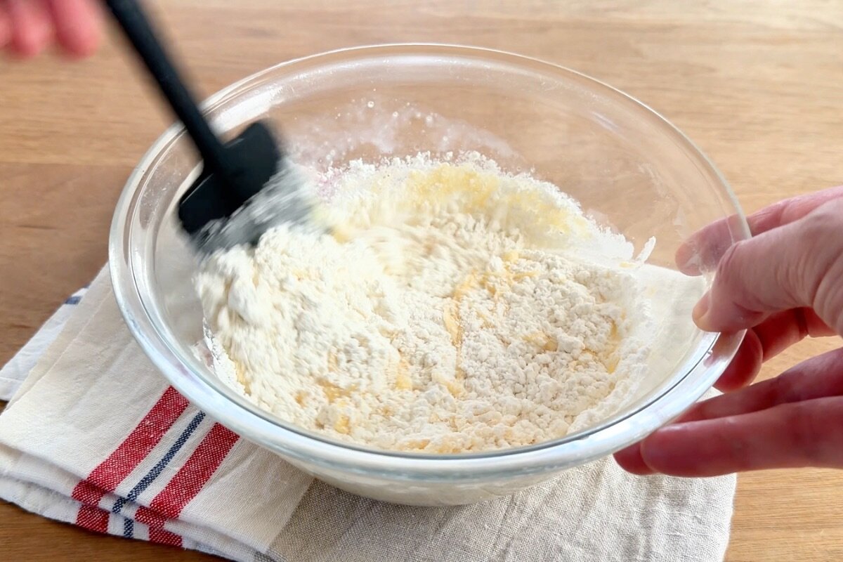 ②ホットケーキミックス80gを入れて全体をさっくりと混ぜる。