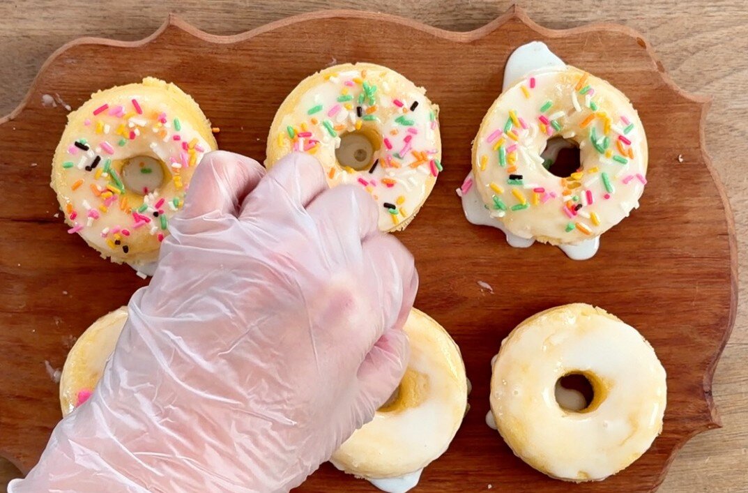 ⑥④のドーナツに⑤のアイシングをかけてから、お好みのトッピングをする。今回は100均の5色ミックスチョコスプレーとカラーシュガーハートでデコレーション。